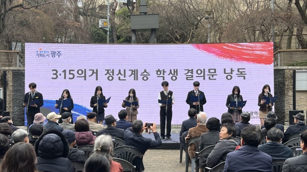 이날 기념식은 3‧15기록영상 상영, 광주3‧15선언문 낭독, 광주3‧15 정신계승 학생 결의문 낭독, 유공자 표창, 기념사 등의 순으로 진행됐다. 특히 광주지역 고등학생을 대표하는 ‘고등학교 학생의회 의장단’이 광주3‧15의거 정신계승을 위한 결의문을 낭독해 의미를 더했다.광주3‧15의거기념사업회 주관으로 3·15의거 현장인 광주 금남로공원에서 ‘곡(哭) 민주주의 장송 데모’를 재현, 3·15의거의 숭고한 의미를 시민들에게 알렸다.박용수 민주인권평화국장은 “부정한 독재정권으로부터 민주주의를 지켜낸 3‧15의거 정신을 온전히 계승해야 한다”며 “3‧15의거 정신을 광주정신으로 이어받아 다시 한번 대한민국의 민주주의를 지키는 데 최선을 다하겠다”고 말했다.