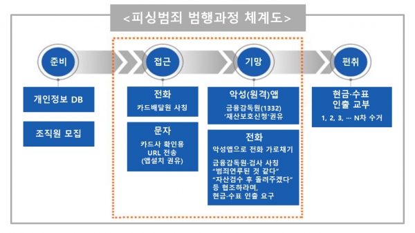 이들은 최근 늘고 있는“신용카드 배달원 사칭전화”로 피해자에게 접근하여 피해자에게 카드발급 확인용 URL을 클릭하여 악성앱을 설치하게 하고, 원격조정하면서 금감원·검사(사칭) 전화 통화로 피해자를 기망하여 결국 현금을 인출하여 교부받는 수법으로 범행을 하였습니다.또한, 피의자들은 피해자로부터 피해금액 수거 후 총책을 검거하지 못하게 하기 위하여 점조직으로 N차 전달 방식으로 범행을 하였습니다.