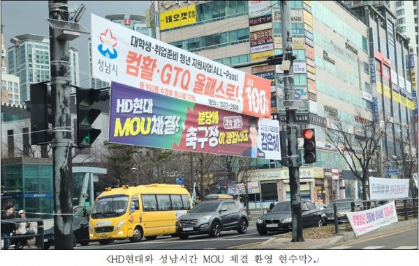 [광성일보] 성남시의회 더불어민주당 최종성 의원(분당, 수내3, 정자2·3, 구미)은 지난 18일 제301회 임시회 제1차 예산결산특별위원회 총괄 질의에서 분당 HD현대그룹글로벌센터 남쪽 제설차량기지에 축구장 조성 문제와 성남도시개발공사 사장 사퇴에 대해 강도 높은 비판을 제기했다.최종성 의원은 “분당 HD현대그룹과 성남시가 체결한 업무협약을 통해 HD현대그룹글로벌센터 남쪽 제설차량기지를 이전하고 약 3,000평 규모의 축구장을 포함한 주민체육시설을 조성하는 계획 자체는 환영한다”라면서도 “그러나 아직 대체부지가 정해지지 않은 상황에서 성급히 홍보 현수막부터 내거는 것은 본말이 전도된 행태”라며, “사업이 확실히 결정되고 시행된 후 홍보하는 것이 순서”라고 강하게 질타했다.<HD현대와 성남시간 MOU 체결 환영 현수막>