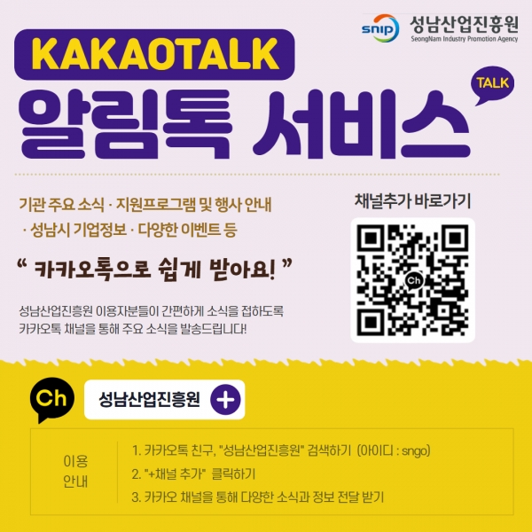 카카오톡 채널 가입은 검색창에서 '성남산업진흥원'을 검색하거나 QR코드를 스캔하면 손쉽게 추가할 수 있으며, 가입자들을 위한 맞춤형 이벤트 또한 계획하여 안내할 예정이다.이의준 성남산업진흥원장은 "고객들이 지원사업 정보를 더 쉽게 접할 수 있도록 카카오톡 비즈니스 채널을 개설했다"라며 "기업지원 절차 간소화, 카카오 채널 개설과 같이 고객 만족을 높일 수 있는 서비스를 계속해서 발굴하여 제공할 것"이라고 말했다.