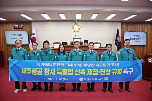 임 의원은 계속해서 “철저한 진상 규명과 엄중한 처벌만이 희생자의 억울함을 달래고 유가족의 상처를 조금이나마 치유할 수 있는 지름길”이라고 강조하고 “이번 참사의 철저한 진상 규명과 피해 구제 지원을 위해 ‘제주항공 참사 특별법’을 조속히 제정하고 진정으로 유가족들의 아픔을 보듬는 대책을 마련해야 한다”고 주장했다.무안군의회는 결의안을 통해 △사고조사위원회의 독립성과 객관성을 확보하고 모든 조사 결과를 투명하게 공개할 것 △피해자 및 유가족에 대한 일상생활 회복 지원 등 일련의 후속 조치를 담은 특별법을 조속히 제정할 것 △피해자 및 유가족에 대한 2차 가해를 방지하기 위한 강력한 법적 조치 방안을 마련할 것을 정부와 국회에 강력히 촉구했다.