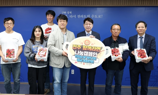 전주시딸기연구회(회장 함장호) 임원진 5명은 25일 전주시청을 방문해 1인 가구 등 위기가구 발굴 지원을 위한 ‘전주 함께라면’에 성금 300만원 을 기탁했다.