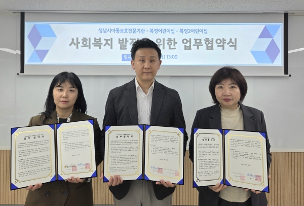 [광성일보] 성남시아동보호전문기관(관장 박동산)은 3월 25일, 복정어린이집(원장 고나나), 복정2어린이집(원장 김은혜)과 성남시 아동 보육 서비스 질적 향상 및 아동보호체계 구축을 바탕으로 성남시 사회복지 서비스의 발전을 위한 업무협약을 체결했다고 밝혔다.