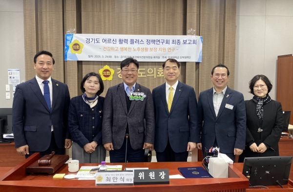 [광성일보] 경기도의회 의원 연구단체인 ‘경기도 어르신 활력플러스 정책연구회’(회장 최만식 의원, 더불어민주당/성남2)는 25일 「건강하고 행복한 노후생활 보장 지원 연구」 최종보고회를 개최했다.이번 보고회에는 최만식 의원을 비롯해 김용성 의원(더불어민주당/광명4), 이오수 의원(국민의힘/수원9), 황세주 의원(더불어민주당/비례) 등 연구회 소속 의원들과 연구 수행기관인 단국대학교 산학협력단 연구진, 관계 공무원 등이 참석했다.