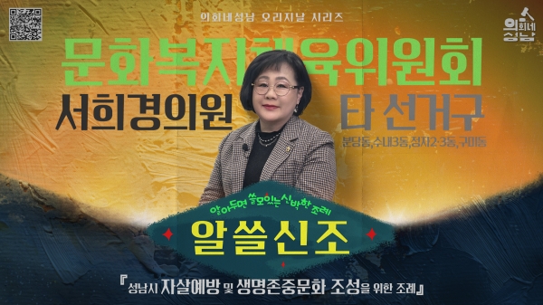 [광성일보] 성남시의회는 ‘알쓸신조-서희경 의원 편’ 영상을 26일 17시 시의회 공식 SNS에 게시한다.이번에 소개될 조례는 서희경 의원 등 11명이 발의한 ‘성남시 자살예방 및 생명존중문화 조성을 위한 조례(일부개정)’이다.