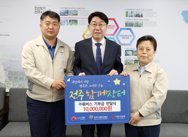 시는 앞으로도 ‘전통시장 살리기’ 사업과 더불어, 이동노동자·콜센터노동자 등 각계각층을 응원하는 ‘노동자 기(氣) 살리기’ 프로젝트를 지속적으로 확대·추진함으로써 지역사회에 활력을 불어넣을 계획이다. ㈜휴비스 관계자는 이날 “이번 기부를 통해 기업이 지역사회와 상생하고, 취약계층을 지원하는 뜻깊은 활동에 동참하게 되어 기쁘다”면서 “앞으로도 전주경제와 지역사회 발전을 위해 적극 협력하겠다”고 밝혔다. 우범기 전주시장은 “내수 침체와 생활물가 상승으로 지역 상권이 어려운 가운데 이렇게 기부와 착한 소비에 동참해주신 ㈜휴비스에 깊이 감사드린다”면서 “휴비스의 참여가 전주의 골목상권과 전통시장에 온기를 불어넣는 마중물이 될 것으로 기대한다”고 말했다. 한편 휴비스는 국내 화학섬유 생산량 1위이자 폴리에스터 단섬유 국내시장 점유율 1위 기업으로, 현재 730여 명을 고용하며 지역경제 활성화에 기여하고 있는 중견기업이다.