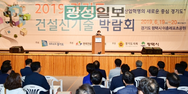 경기도는 건설 신기술의 현재와 미래를 만나볼 수 있는 ‘2019 경기도 건설신기술 박람회’가 평택시 이충레포츠공원 실내체육관에서 19일 개막식을 시작으로 2일간의 일정을 시작했다.