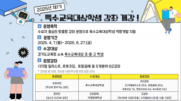 [광성일보] 경기도교육복지종합센터(관장 피성주)가 ‘2025년 찾아가는 특수교육대상학생 강좌’를 운영한다.4월 7일부터 6월 27일까지 진행하는 이번 강좌는 특수교육학생을 대상으로 다양한 분야의 교육 기회를 지원하고자 마련됐다.대면과 비대면 방식으로 진행하는 이번 강좌는 ▲코딩 입문(5교) ▲로봇 코딩(7교) ▲디지털 일러스트(25교 및 비대면 1강좌) ▲종합공예(20교) ▲독서토론(3교 및 비대면 1강좌) 등 총 62개의 강좌를 마련했다.