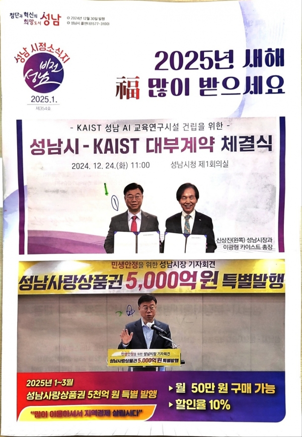 [광성일보] 성남시가 매월 발간하는 시정소식지 『비전성남』이 그 본래의 취지를 벗어나 특정 인물, 즉 신상진 시장의 홍보지로 변질되고 있다는 지적이 제기되고 있습니다. 이군수 시의원은 지난 1월호부터 지속적으로 『비전성남』에 게재되는 시장의 사진과 이름의 빈도에 주목해 왔으며, 특히 최근 발간된 4월호에는 총 29장의 신상진 시장 사진과 20회의 이름 언급이 확인되었다고 밝히고 있습니다.(1월호에는 총 31곳 사진)