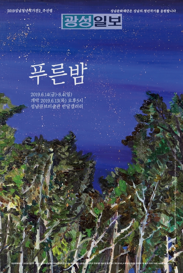 올해 두 번째 전시의 주인공인 주선영 작가는 경원대학교 대학원 회화과에서 서양화를 전공했고, 지난 2014년 성남문화재단 신진작가공모전 입상으로 성남문화재단과 첫 인연을 맺었다. 오는 8월 4일(일)까지 이어지는 이번 전시에서는 <주선영: 푸른밤>이라는 제목처럼 작가의 대표작인 푸른밤 시리즈부터 숲과 풀을 주제로 한 회화, 드로잉 등 작가의 다양한 작품을 만날 수 있다.