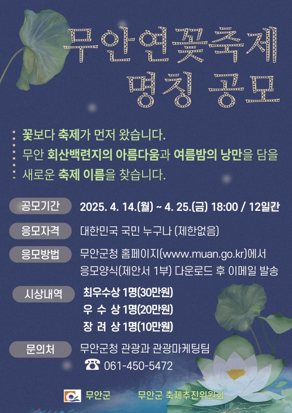 이에 따라, 군은 연꽃 개화시기에 얽매이지 않고 축제의 다양성과 지속성을 확보하고자 축제 명칭 공모에 나서게 됐다.축제 명칭은 기존 연꽃축제의 상표 가치를 유지하면서도, 회산백련지의 자연과 야간 경관이 어우러지는 축제 콘셉트를 반영할 수 있어야 한다.공모는 오는 4월 25일까지이며, 국민 누구나 참여할 수 있다.참여는 무안군 홈페이지 고시공고(www.muan.go.kr)를 참고하여 신청서류를 작성한 후 전자우편(hjung1112@korea.kr)으로 제출하면 된다.