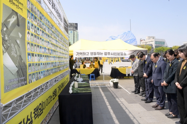 ‘여의도 집무실’로 출근한 강기정 광주시장은 이날 오후 경기도 안산시에서 열리는 ‘세월호 참사 11주기 기억식’에 참석, 참사 희생자들을 추모할 예정이다.고광완 행정부시장과 공직자들도 이날 오전 5·18민주광장에 마련된 ‘세월호 11주기 시민합동분향소’를 찾아 희생자들을 기렸다.광주시 공직자들은 합동분향소에서 희생자들의 넋을 기리고 유가족의 마음을 위로하는 한편 안전사회를 만드는 데 앞장설 것을 다짐했다. 특히 안전과 생명을 지키는 파수꾼 역할을 자처한 세월호 유가족에 대해서도 감사의 인사를 전했다.