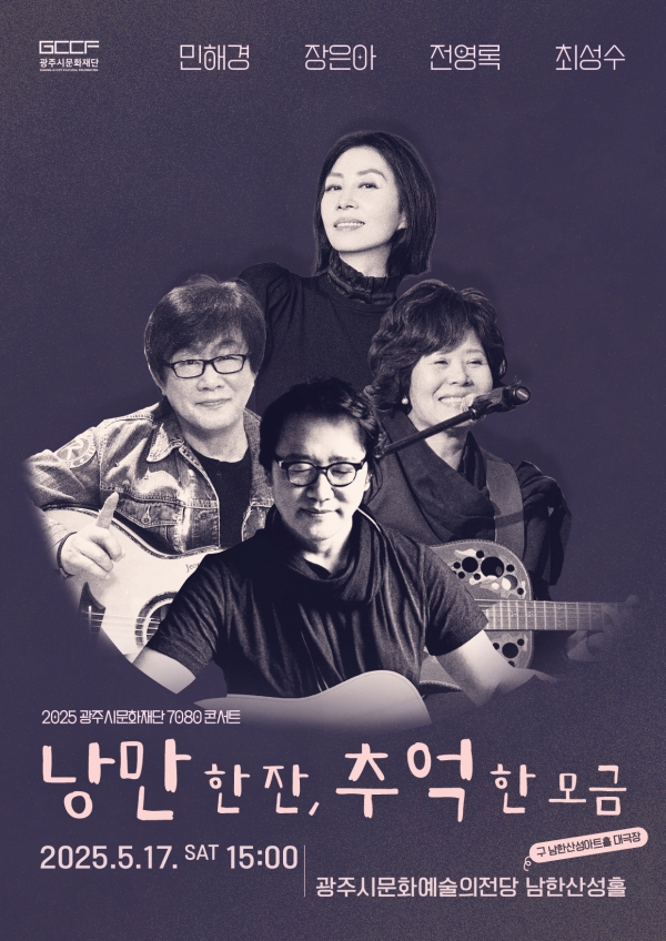 [광성일보] 재단법인 광주시문화재단(대표이사 오세영)은 오는 5월 17일 토요일 오후 3시, 광주시문화예술의전당 남한산성홀에서 1970~80년대 레전드 가수들과 함께하는 특별 공연 ‘낭만 한 잔, 추억 한 모금’을 선보인다. 이번 무대는 그 시절의 감성과 낭만을 다시 떠올릴 수 있는 소중한 시간으로 꾸며질 예정이다.