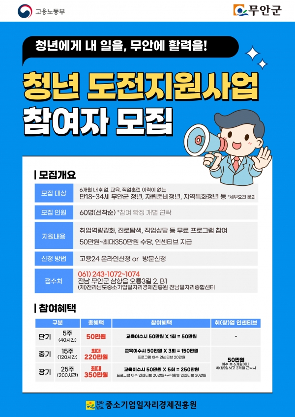 [광성일보] 전남 무안군(군수 김산)은 ‘2025년 청년도전지원사업’ 참여자를 상시 모집하고 있다.이 사업은 지난 2월 고용노동부 공모에 최종 선정돼 사업 수행기관인 전라남도중소기업일자리경제진흥원에서 본격적으로 운영하고 있다.