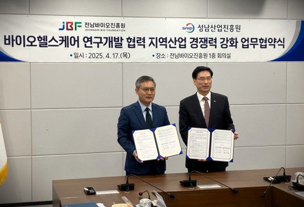 성남산업진흥원(원장 이의준)과 전남바이오진흥원(원장 윤호열)이 첨단 기술 기반 R&D 혁신 및 바이오헬스케어 생태계 발전을 위해 협력을 강화한다