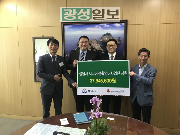 성남시는 이날 오전 10시 시청 복지국장실에서 이균택 국장, 변화영 생활인재교육연구소 대표, 이정우 분당노인종합복지관장, 이범열 경기도공동모금회 모금팀장 등이 참석한 가운데 ‘시니어 생활영어 사업 기탁금 전달식’을 했다.