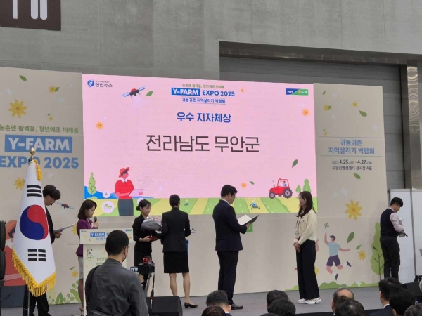[광성일보] 전남 무안군(군수 김산)이 지난 25일부터 27일까지 3일간 수원컨벤션센터에서 열린 ‘Y-Farm Expo 2025 귀농귀촌 지역살리기 박람회’에 참가해, 귀농·귀촌 우수 지자체 농촌진흥청장상을 수상하는 영예를 안았다.