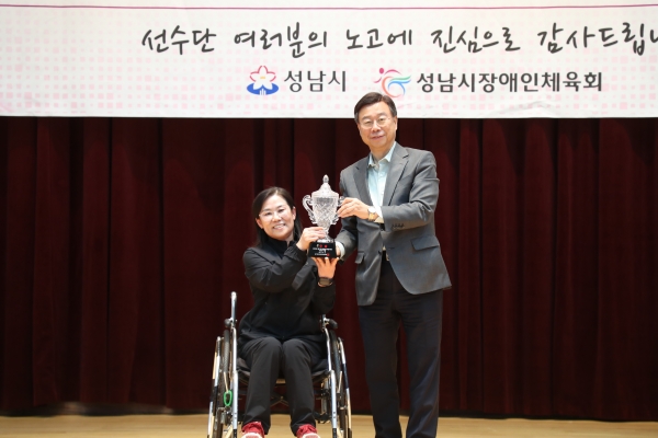 행사에서 신 시장은 장애인체육회 상임부회장으로부터 단기를 이양받고, 종합 우승기와 우승컵 봉납식에 참여하며 성남시의 우수한 경기 성과를 축하했다. 또한 종목별 가맹단체장들로부터 우승컵을 전달받고 출전선수단에게 입상지원금 증서를 전달하며 노고를 격려했다.신 시장은 인사말을 통해 “출전선수 여러분이 땀 흘려 부단히 노력하고 최선을 다했기에 압도적인 성적으로 경기도장애인체육대회 3연패의 쾌거를 이룰 수 있었다”며 선수들과 감독, 코치진에게 감사와 축하의 마음을 전했다.