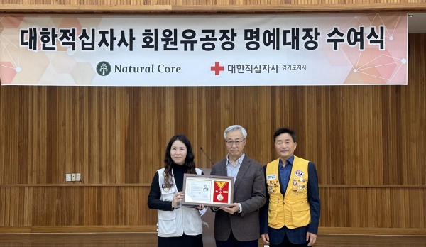 ‘적십자 회원유공장 명예대장’은 적십자 사업 발전에 기여한 기관 및 개인에게 수여하는 포장으로 적십자 재원 조성(누적 기부금품 1억원 이상) 및 인도주의 정신 확산에 기여한 자에게 전수하는 표창이다. 네츄럴코어는 2016년부터 9년간 정기후원에 참여하여 지역 사회를 위한 나눔을 지속해왔다.