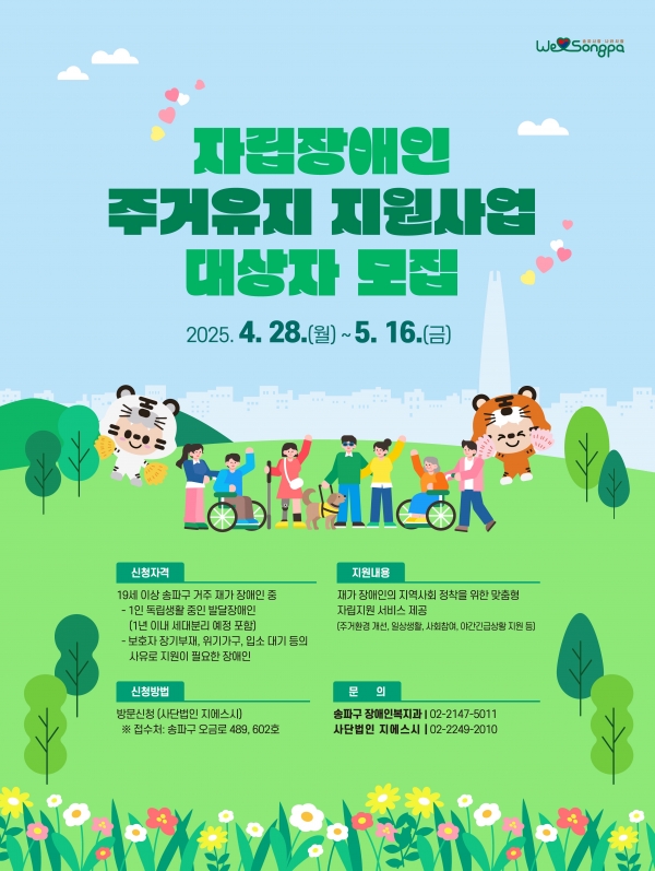 구는 이번 사업을 계기로 관내 거주 재가장애인들의 실질적인 자립 기반을 마련할 계획이다. 올해 1월 서울시 공모에 선정돼 사업 예산 1억 2천만 원도 확보했다.주요 지원 내용은 주거지원 연계(주거환경 조성), 일상생활 서비스 신청, 야간 긴급상황 지원(응급안전안심서비스) 등이다. 대상자의 탈시설 욕구, 생활환경 등을 고려해 개인별 자립계획을 수립해 맞춤형으로 지원한다.신청 대상은 19세 이상 송파구 거주 재가장애인 중 ▲보호자 부재나 질병 등으로 지역 내 거주가 어려운 경우 ▲학대 피해로 가정 분리 지원이 필요한 경우 ▲위기가구 중 돌봄이 필요한 중증장애인 ▲1인 독립생활 중인 발달장애인 등이다.