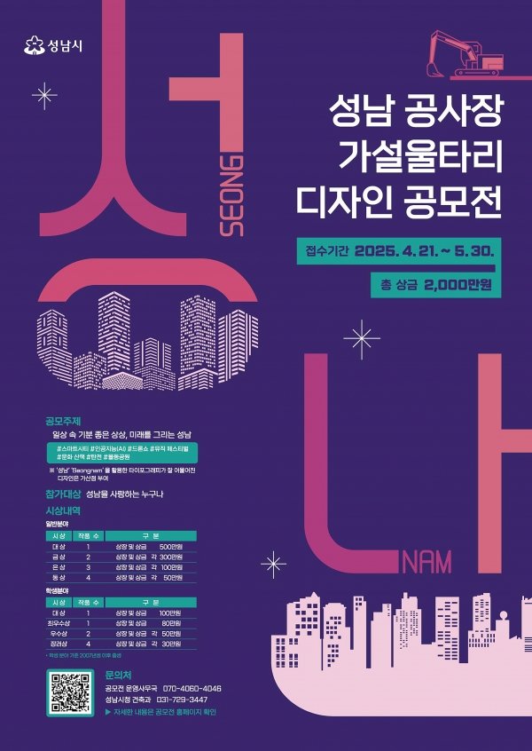 작품 접수는 공모전 홈페이지(https://www.loud.kr/contest/view/168964/brief)를 통해 온라인으로 진행된다.수상작은 향후 성남시 내에서 진행되는 각종 공사 현장의 가설울타리에 실제 적용되어, 도시 미관을 개선하고 보다 쾌적한 환경 조성에 활용될 예정이다.신상진 성남시장은 “이번 공모전을 통해 시민들의 창의적인 아이디어를 발굴하고, 도심 속 공사장을 문화와 개성이 공존하는 매력적인 공간으로 탈바꿈시킬 수 있도록 많은 관심과 참여를 바란다”고 말했다.