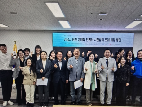 [광성일보] 성남환경운동연합은 5월 9일(금), 성남시의회 4층 세미나실에서 『성남시 탄천의 생태적 관리와 시민참여 조례 제정 방안』 토론회를 개최했다. 하지원 에코나우 대표가 좌장을 맡아 탄천에 자연기반해법(NbS)을 적용하고, 시민참여 기반의 생태적 관리체계를 강화하기 위한 조례 제정 방안을 논의했다. 성남시의회 정용한 의원(국민의힘, 정자·금곡·구미1동)과 조정식 의원(더불어민주당, 정자·금곡·구미1동)이 조례 제정 필요성에 공감하고, 조례 제정 추진에 나서기로 했다.이희예 성남환경운동연합 사무국장은 성남시의 자연기반해법 적용 사례로 미금보·백현보 철거와 수질 개선 등의 생태복원 성과를 소개하고, 이를 바탕으로 『성남시 탄천의 생태적 관리와 시민참여 조례(안)』 제정의 필요성을 설명했다. 조례안은 시민·전문가·행정이 함께하는 ‘탄천시민위원회’ 설치, 5년 주기의 탄천관리기본계획 수립, 탄천시민과학자 육성과 생물다양성의 날 등 시민참여형 생태문화 프로그램 운영, 정책 평가와 실행계획 반영 등의 내용을 담고 있다.