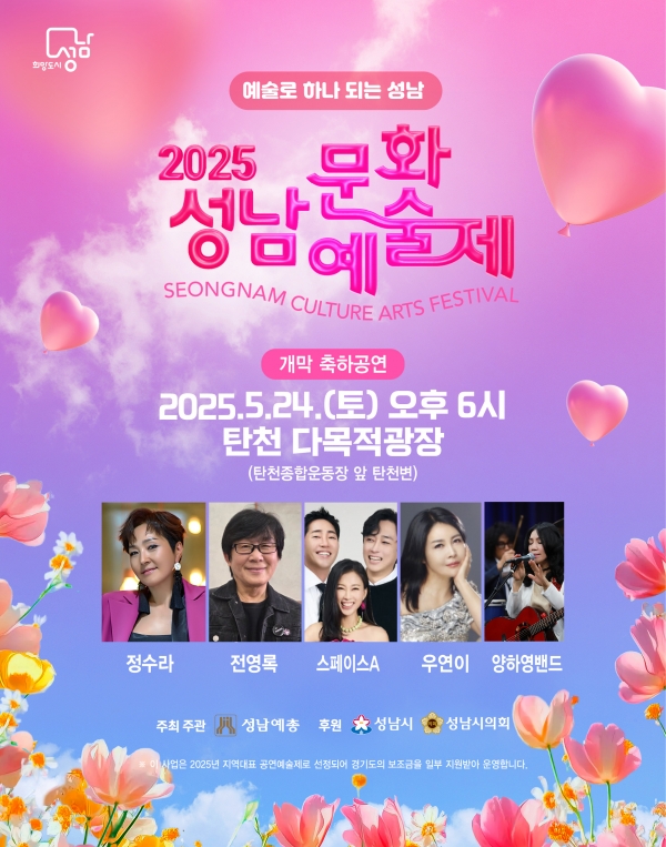 특히 5월 24일(토) 오후 6시에 열리는 「개막 축하공연」은 아나운서 조은설의 사회로 진행되며, 이영순무용단의 오고무와 풍물소리사위의 사물놀이 협연 ‘하늘의 울림’으로 성남문화예술제의 막을 올린다.이 공연은 축제의 힘찬 시작을 알림과 동시에, 그 울림이 하늘에 닿고 성남시민의 마음속에 깊이 스며들어 축제의 마지막까지 흥겨움이 이어지길 바라는 의미를 담고 있다.이날 무대에는 정수라, 전영록, 스페이스A, 우연이, 양하영 밴드의 초청가수들이 출연해 다채롭고 풍성한 공연을 선보일 예정이다.탄천 다목적광장에서는 공연 외에도 시민들이 함께 즐길 수 있는 다양한 체험 프로그램이 마련된다.행사 기간 동안 푸드트럭과 체험부스가 운영될 예정으로, 축제의 즐거움을 더할 예정이다.