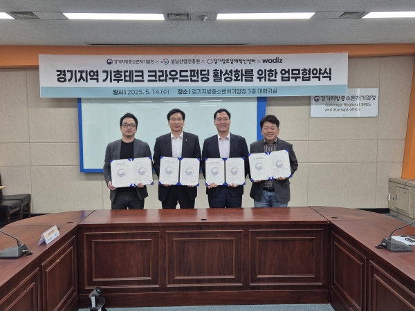 [광성일보] 성남산업진흥‘기후테크 크라우드펀딩 활성화원(원장 이의준)은 5월 14일 경기지방중소벤처기업청(청장 조희수),경기창조경제혁신센터(대표 김원경) 및 와디즈임팩트(주)(대표 최동철)와 함께 를 위한 업무 협약’을 체결했다.* 와디즈임팩트(주) : 와디즈(주)의 자회사로, 정부 지원사업, 교육사업 등 추진