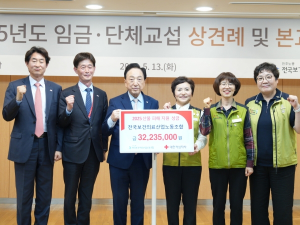 최희선 위원장은 전달식에서 “산불로 고통받는 이재민들에게 작은 위로가 되길 바란다”며 “전국보건의료산업노동조합(이하 ‘보건의료노조’)은 국민 건강은 물론, 사회적 위기에도 함께하는 조직이 되겠다”고 밝혔다.김철수 회장은 “보건의료노조에서 모아주신 성금은 피해 지역의 회복과 재건을 위해 소중히 사용하겠다”며 “대한적십자사는 앞으로도 도움이 필요한 이웃을 위해 지속적인 구호 활동을 이어가겠다”고 전했다. 한편, 보건의료노조는 2022년 동해안 산불 피해 지원 성금, 튀르키예 지진 피해 복구 성금 등 대한적십자사를 통해 총 57백만 원을 기부한 바 있다.