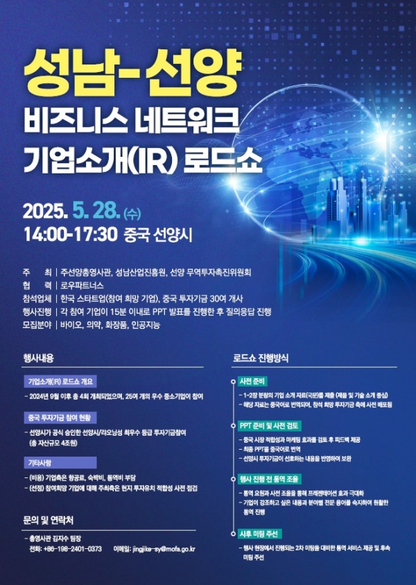 이의준 성남산업진흥원장은 “중국은 우리 기업들에게 여전히 중요한 투자처이자 시장”이라며 “이번 선양 IR 로드쇼는 현지 영사의 적극적 노력으로 이루어져, 성남 기업들의 글로벌 투자 유치 역량을 높이고 중국 진출의 실질적 계기를 마련하는데 도움이 될 것” 이라고 밝혔다.참가기업에 대해서는 중국어 IR 자료 컨설팅과 투자사 사전 매칭 등 투자 상담 전과정을 지원하며, 하반기에도 참가 기업을 모집하여 현지 로드쇼를 개최할 계획으로 모집공고는 성남산업진흥원 누리집을 통해 확인할 수 있다.
