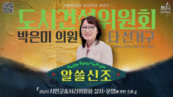 [광성일보] 성남시의회는 ‘알쓸신조-박은미 의원 편’ 영상을 28일 17시 시의회 공식 SNS에 게시한다.이번에 소개될 조례는 박은미 의원 등 11명이 발의한 ‘성남시 시민고충처리위원회 설치·운영에 관한 조례’이다.
