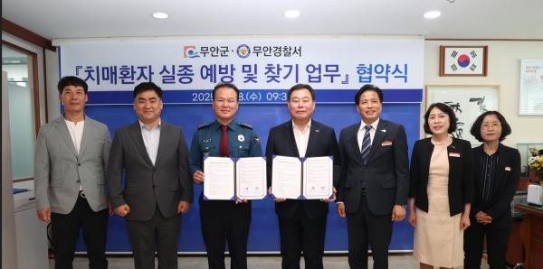 [광성일보] 전남 무안군(군수 김산)과 무안경찰서(서장 정성일)는 28일 치매환자의 실종 예방과 실종 발생 시 신속한 발견과 보호를 위한 ‘치매환자 실종 예방 및 찾기 사업’ 업무협약을 체결했다.