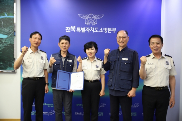 [광성일보] 전북특별자치도소방본부(본부장 이오숙)는 5월 30일 도청 3층 소방본부장실에서 지리산국립공원 내 산불 발생 초기 대응에 기여한 남원시 산내면 부운리 와운마을에 대해 전라북도지사 단체 표창을 전수했다고 밝혔다.전수식에는 공성훈 와운마을 이장과 노군포 새마을지도자를 비롯해 소방본부장, 119종합상황실장, 화재조사팀장, 인월119안전센터장이 참석했다.