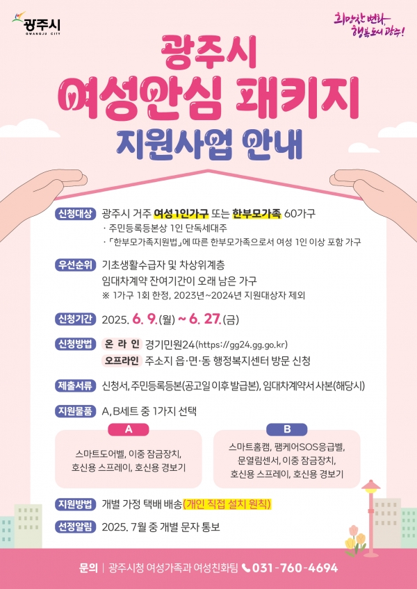 올해 신청 대상은 광주시에 주민등록이 되어 있는 여성 1인 가구, 또는 여성 1인 이상이 포함된 한부모가족이다. 신청은 6월 9일부터 27일까지 경기민원24 온라인 시스템 또는 주소지 관할 행정복지센터 방문을 통해 가능하다.지원 물품은 신청 시 수혜자가 A세트와 B세트 중 선택할 수 있으며 시에서 대상자를 선정한 후 각 가정에 택배로 배송된다. 배송 물품에는 설치 설명서가 함께 동봉돼 있으며 수혜자가 직접 설치·관리할 수 있다.특히, 올해는 지난해의 단일 세트 지원 방식에서 벗어나 구성 물품을 다양화한 두 가지 세트로 운영해 수혜자에게 보다 맞춤형 지원을 제공할 계획이다.