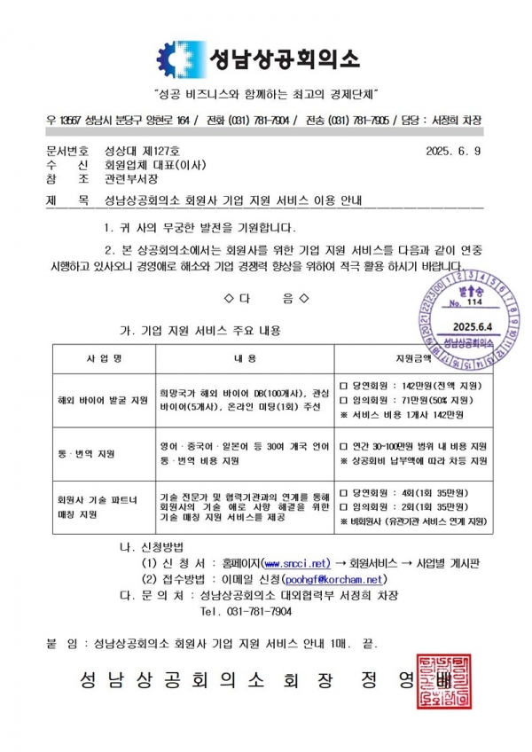 *지원서비스 (※ 자세한 사항 : 공문 및 회원서비스 안내 참조)- 해외 바이어 발굴 지원- 통·번역 지원 회원사 기술 파트너 매칭 지원 신청방법- 신청서 : 홈페이지(www.sncci.net) → 회원서비스 → 사업별 게시판 - 접수방법 : 이메일 신청(poohgf@korcham.net)*문의처- 성남상공회의소 대외협력부 031-781-7904
