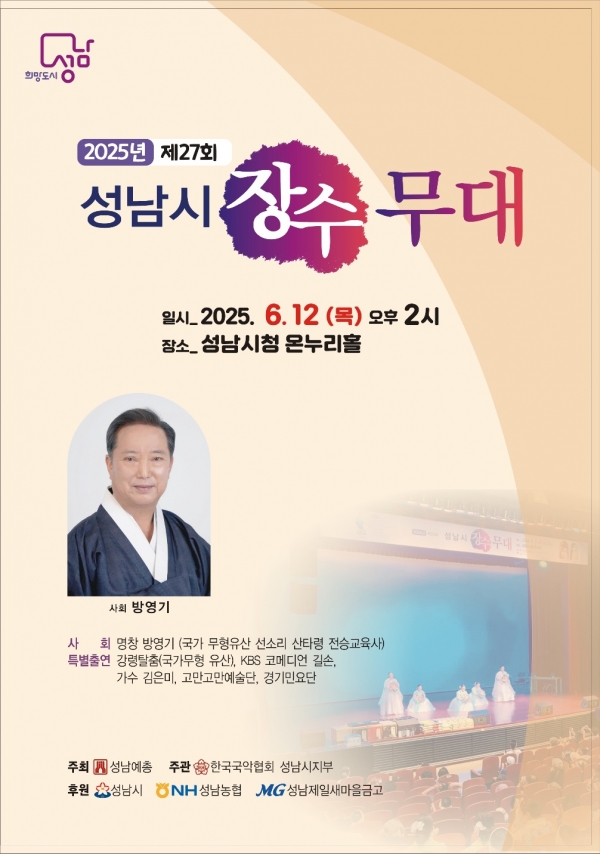 [광성일보] 성남시 어르신들의 한마당 축제인 ‘제27회 성남시 장수무대’가 6. 12(목) 오후 2시부터 성남시청 1층 온누리홀에서 성남예총(회장 송위혁) 주최, 한국국악협회 성남시지부(지부장 이향우)주관으로 펼쳐진다.