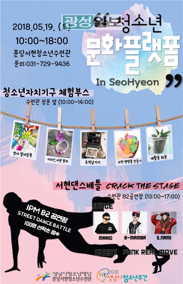 성남시청소년재단 분당서현청소년수련관은 2018. 성남시청소년주간을 맞이하여 청소년들의 문화예술 활동을 지원하고, 건전한 여가생활 함양을 위하여 5월 19일(토) 수련관 전면 출입구 및 공연장에서‘2018. 청소년문화플랫폼’(서현 댄스 배틀대회, 자치기구 체험부스)를 진행 할 예정이다.