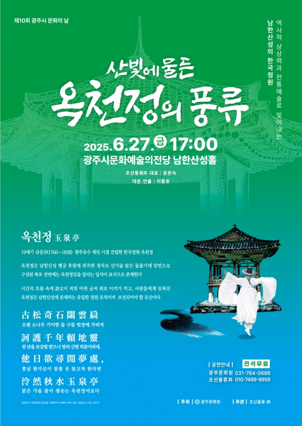 올해는 남한산성의 유일한 정원 유적인 옥천정을 주제로 한 “산빛에 물든 옥천정의 풍류” 공연으로 시민들의 곁을 찾아왔다.옥천정은 조선시대 순조 대에 광주유수로 부임한 심상규에 의해서 만들어져, 그의 벗들과 당대의 명사들이 두루 찾아와 시를 읊고 풍류를 즐기며 선비문화를 꽃피웠던 곳이다.광주문화원은 “옥청정이 시민들에게 다소 낯선 이름일 수 있기에, 이번 공연에서는 우리에게 익숙한 조선 시대 대표적 여류 문인인 황진이, 허난설헌, 매창을 초대하여 옥천정에서 펼쳐졌던 아름다운 풍류 이야기를 오늘의 감성으로 새롭게 풀어내고자 한다” 고 밝혔다.