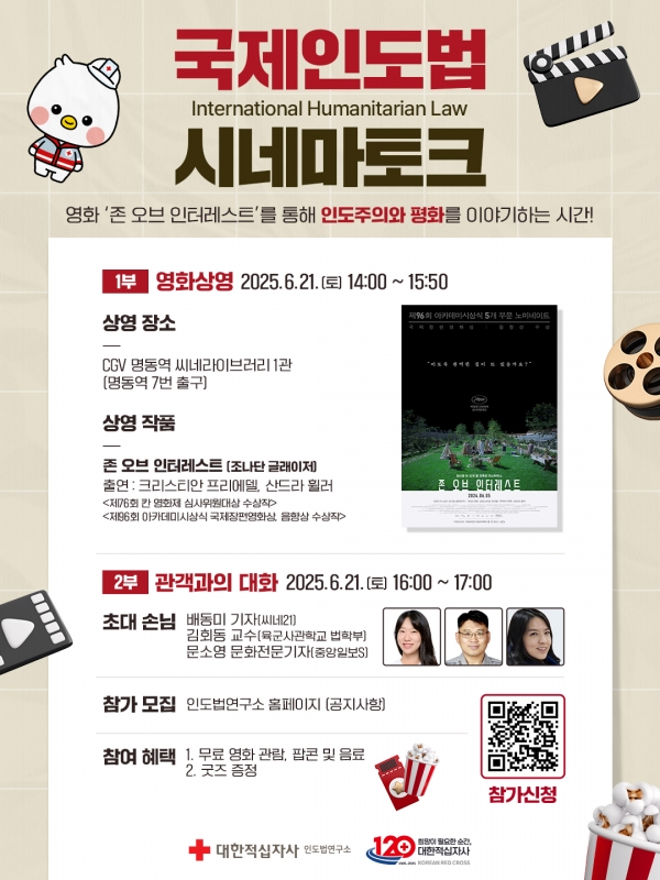 [광성일보] -대한적십자사 인도법연구소(소장 박은영)는 이달 21일, CGV 명동역 씨네라이브러리에서‘국제인도법 시네마 토크’를 개최한다.‘국제인도법 시네마 토크’는 영화가 지닌 몰입감과 서사적 힘을 활용해, 국제인도법의 개념과 의미를 대중에게 자연스럽게 전달하는 인문·교양 프로그램이다. 올해로 5회째를 맞은 이번 행사는 ▴1부 영화 상영 ▴2부 전문가와의 대화로 구성되며, 참가비는 무료다.