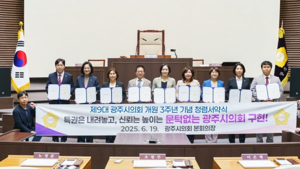 이번 서약식은 제9대 광주시의회 개원 3주년을 맞아 그동안의 의정활동을 되돌아보고, 공직자로서의 기본 책무인 청렴의 가치를 되새기기 위해 마련됐다. 특히 시민으로부터 신뢰받는 의회로 거듭나기 위한 의지를 다지는 뜻깊은 자리였다.서약식에는 허경행 의장을 비롯한 전체 시의원과 의회사무국 직원 등 30여 명이 참석했으며, 참석자들은“특권은 내려놓고, 신뢰는 높이는 문턱 없는 청렴의회를 구현하겠다”는 내용이 담긴 청렴서약문을 낭독하며 청렴 실천 의지를 다짐했다.