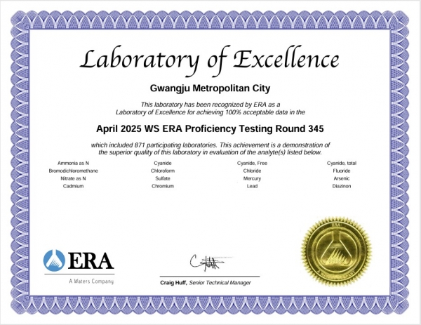 수질연구소는 이번 국내외 검증기관 숙련도 시험에서 먹는물 분야 미생물 1항목, 중금속 5항목, 소독부산물 3항목, 이온류 4항목, 농약류 2항목, 유·무기물 3항목 등 7개 분야 총 18개 항목 모두 적합 판정을 받아 국제 수준의 수질분석 능력을 다시 한 번 입증했다.정숙경 광주상수도사업본부 수질연구소장은 “지속적으로 먹는물 검사기관 분석 역량을 강화해 측정분석 결과에 대한 신뢰도를 높이겠다”며 “이를 통해 시민들이 수돗물을 안심하고 마실 수 있도록 최선을 다하겠다”고 말했다.