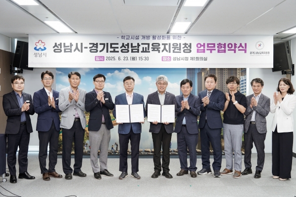 [광성일보] 성남시와 경기도성남교육지원청은 6월 23일 ‘학교시설 개방 활성화에 관한 업무협약’을 했다.이날 오후 3시 30분 시청 4층 제1회의실에서 열린 협약식에는 신상진 성남시장과 한양수 경기도성남교육지원청 교육장, 초·중·고등학교 교장 대표 등이 참석했다.