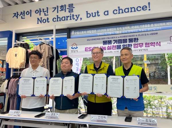 이를 위해 성남시는 6월 24일 오후 2시 야탑동 소재 굿윌스토어(장애인 직업재활시설) 1층에서 노숙인종합지원센터, 안나의집 등 5곳 시설장과 ‘ESG 나눔 실천-기증 의류 선순환 사업 추진에 관한 업무 협약’을 했다.협약에 따라 장애인직업재활시설은 굿윌스토어 1~4호점(장애인 근로자 62명)을 통해 시민과 기업이 기증한 의류 등을 손질 세탁한다.노숙인종합지원센터는 근로 장애인들이 손질한 의류를 거리 노숙인과 일시보호소 노숙인에게 전달해 사회활동 참여를 지원한다.안나의집 노숙인자활시설은 노숙인들이 굿윌스토어 매장에서 의류를 직접 구매하도록 안내해 근로 장애인과 상호작용을 통한 사회 적응을 지원한다.