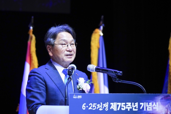강 시장은 이어 “75년 전 한반도에서 일어난 대한민국의 6·25전쟁은 그 자체로 비극이다. 비극이 다시 되풀이되지 않도록 세계의 평화를 지키고 우리 민족의 공존공영을 이끌어 내는 것이 6·25전쟁이 준 교훈이자 호국영령들의 희생에 보답하는 길이라 믿는다”며 “광주시도 평화의 길에 작지만 소중한 징검다리를 만들어가겠다”고 강조했다.광주시는 국가유공자의 명예를 높이기 위한 정책도 강화하고 있다. 올해부터 국가유공자의 손자녀까지 ‘빛고을장학금’ 지원 대상에 포함해 지역 고등학생과 대학생에게 장학금을 지급하고 있다.광주시는 앞으로도 보훈가족의 자긍심을 높이고 실질적 지원이 이뤄지도록 다양한 정책을 지속 추진할 방침이다.