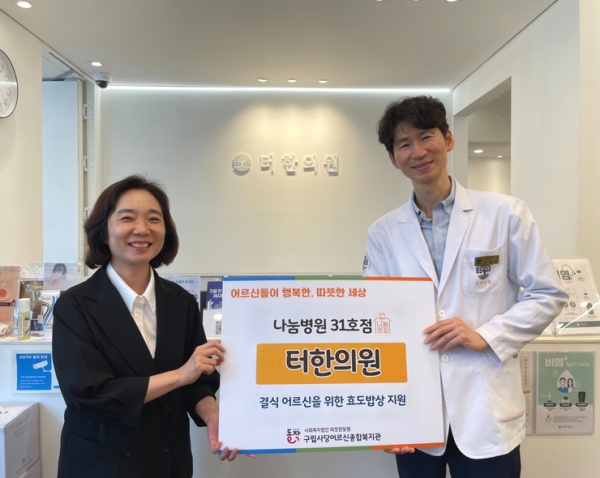 [광성일보] 사회복지법인 따뜻한동행 사당어르신종합복지관(관장 조희정)은 6월 25일(수), 터한의원 사당점(대표원장 곽봉석)과 함께 나눔병원 후원 전달식을 진행했다.사당어르신종합복지관의 나눔병원은 결식 어르신이 없는 따뜻한 세상을 만들기 위해 정기적으로 후원에 동참하는 의료기관이다.