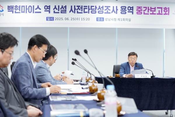 [광성일보] 성남시(시장 신상진)는 25일 시청 제1회의실에서 ‘백현마이스 역 신설 사전타당성조사 용역’ 중간보고회를 개최했다.이날 보고회에는 신상진 성남시장을 비롯해 백현마이스 도시개발사업 시행자, 철도사업 추진 자문단, 용역 수행 전문가 등이 참석해 신설역 추진 경과를 점검하고 주요 사항에 대해 논의했다.