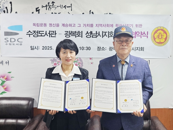 [광성일보] 성남도시개발공사(사장 이희석, 이하 공사) 수정도서관은 광복회 성남시지회와 ‘광복 80주년 기념’ 사업 추진을 위한 업무협약을 체결했다고 2일 밝혔다.이번 협약은 광복 80주년을 맞아 독립운동의 숭고한 정신을 기리고, 시민들의 건강한 역사의식과 민족적 자긍심 함양을 위해 추진됐다.