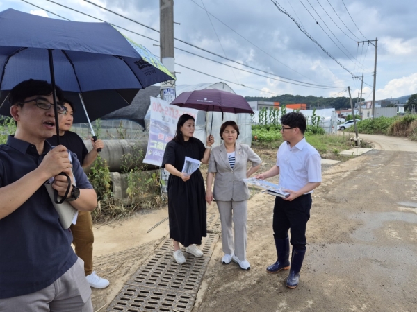 [광성일보] 광주시의회 조예란 도시환경위원장(국민의힘)은 지난 7월 22일, 광주시 추자동 253-3번지 일원의 상습침수 문제 해결을 위해 인접 지역인 용인시 모현읍 일산리 387번지 일원 비닐하우스 밀집지를 오포1동장과 함께 방문해 현장을 점검하고, 침수 피해의 근본적 차단을 위한 정비 방안 마련을 모현읍장과 협의했다.