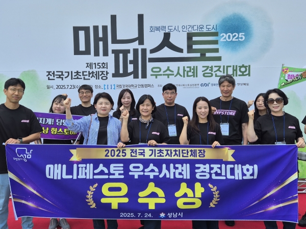 [광성일보]  성남시(시장 신상진)는 전국 기초자치단체장 매니페스토 우수사례 경진대회에서 소상공인 이색점포 발굴 지원사업인 힙스토어 사례로 경제·지역산업 분야 ‘우수상’을 받았다고 25일 밝혔다.지난 2023년 근로 장애인 출근 전용버스, 지난해 발달장애인 청년주택 지원 사례로 각각 최우수상을 받은 데 이은 3년 연속 수상 성과다. 한국매니페스토실천본부와 경북연구원이 공동 주최한 이번 대회는 1차 서류심사를 통과한 191개 사례를 해당 지자체가 7월 23일과 24일 양일간 경상북도 안동시 국립경국대학교에서 7개 분야로 나눠 발표하는 방식으로 진행됐다.