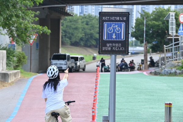 [광성일보] 하남시(시장 이현재)는 자전거 이용자와 보행자의 안전을 위해 당정뜰 자전거도로 초입(신장동 244)에 전국 최초로 스마트 사고위험 방지시스템을 설치하고 지난 7월 30일부터 본격 운영을 시작했다고 밝혔다.해당 구간은 보행자 산책로와 자전거도로가 교차하는 구조로, 특히 자전거도로 일부가 내리막 형태를 띠고 있어 속도 증가에 따른 사고 위험이 상존하던 지역이다.